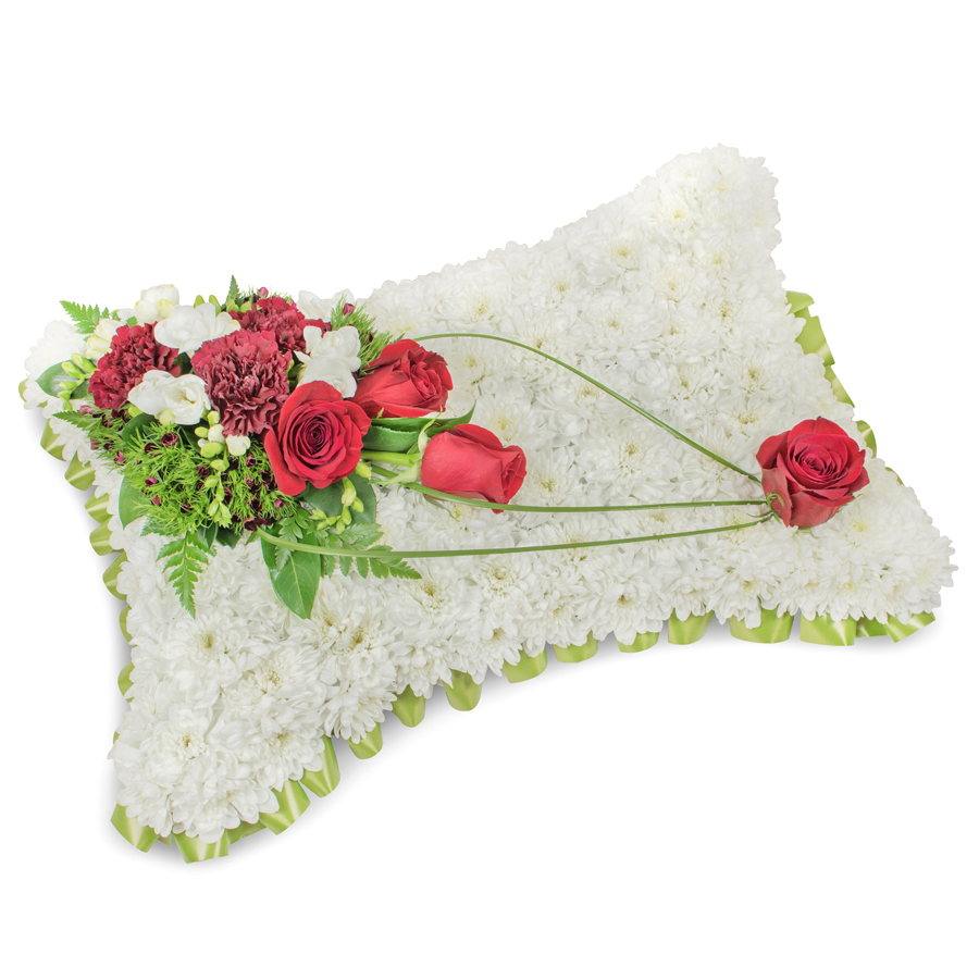 Offer your heartfelt sympathy with our timeless flower bouquet, expertly crafted to bring comfort and elegance. This beautiful arrangement features a mix of white chrysanthemums, red roses, white freesias, and dark red carnations, enhanced by dianthus and bear grass.